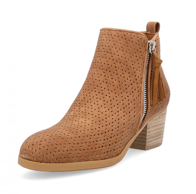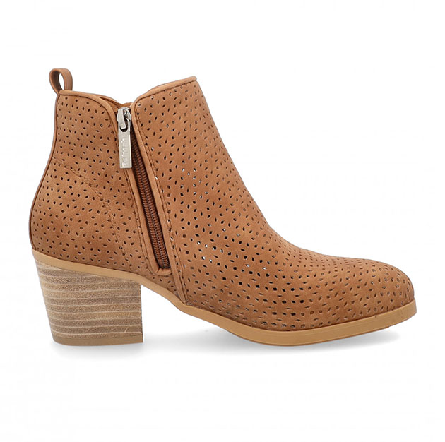 Tronchetto Donna camel vegan, realizzato con design traforato. Presenta chiusura con zip laterale, morbida soletta e suola antiscivolo. Nappa decorativa. Design iconico per questo tronchetto da indossare tutto il giorno.