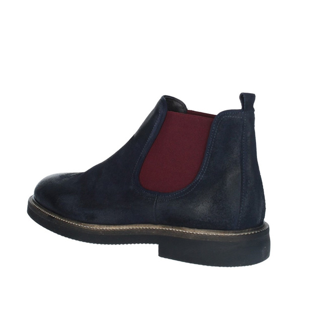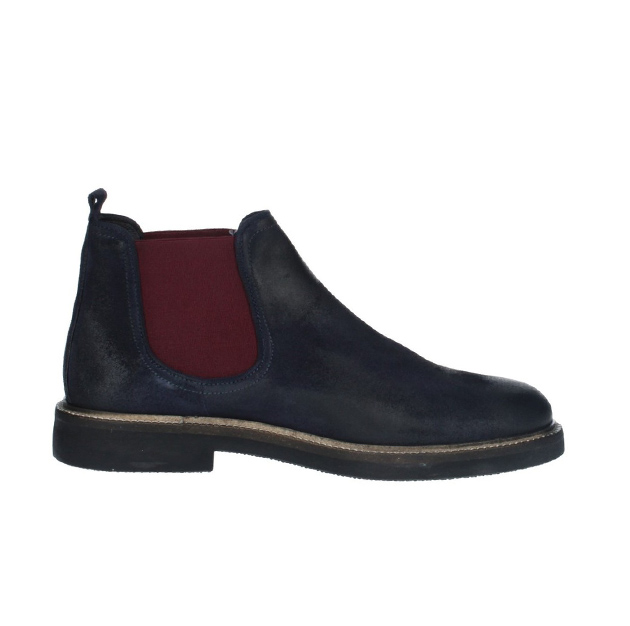 Tronchetto Uomo blu in pelle scamosciata, effetto anticato. Elastici laterali bordeaux a contrasto. Stile e comoditร caratterizzano questa scarpa adatta ad ogni outfit. Made in Italy.