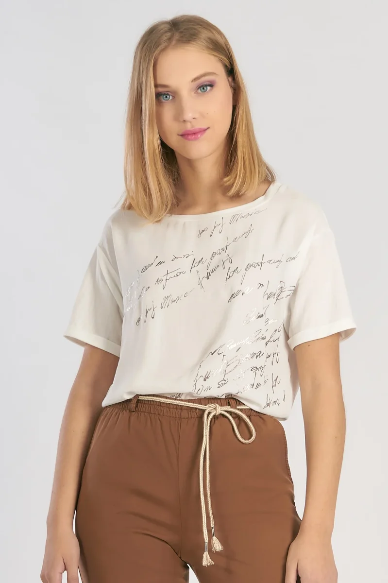 Casacca scollo a barchetta con stampa scritte lamèVestibilità regolare Casacca scollo barchetta Tessuto jersey viscosa Vestibilità regolare La modella è alta 172cm e indossa la taglia m