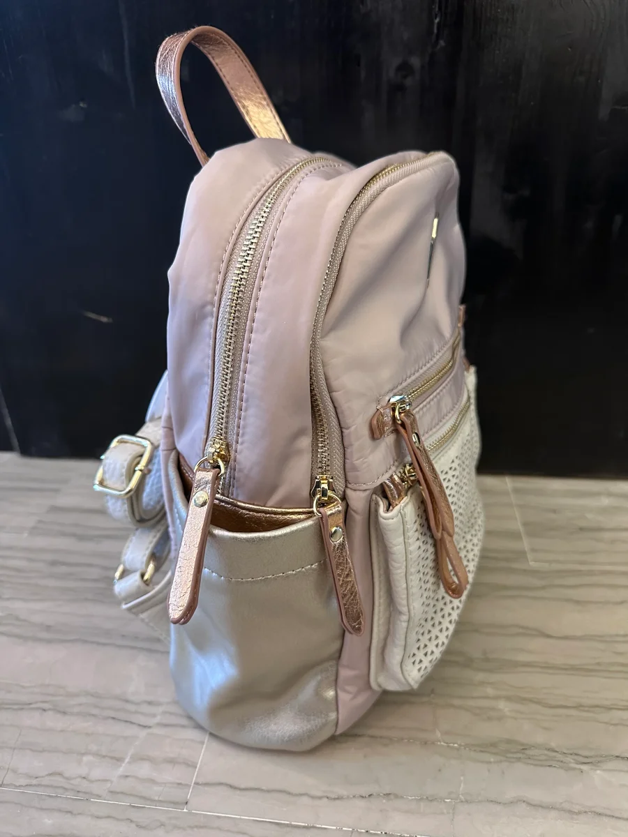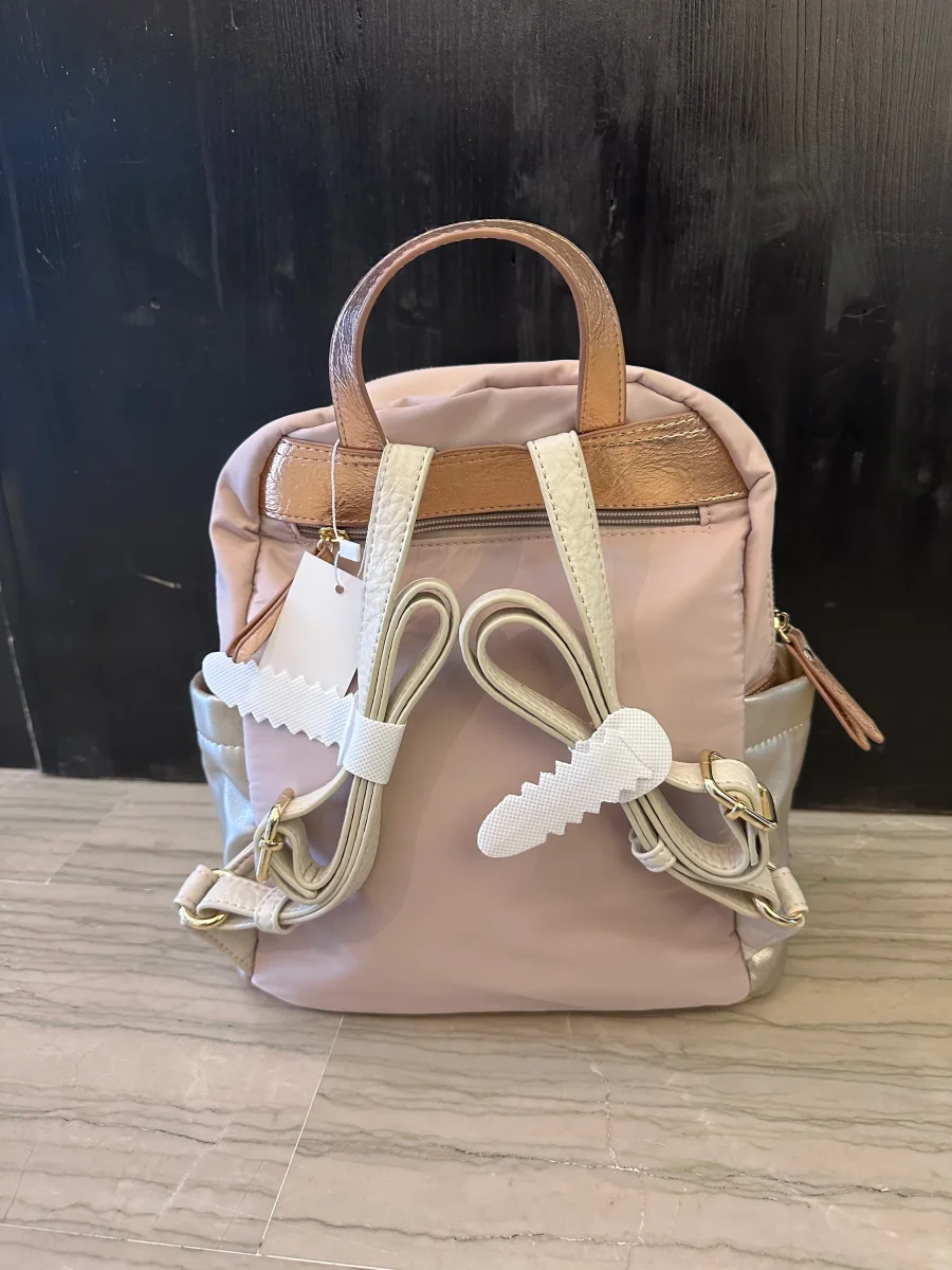 Zainetto donna beige e rosa tenue con dettagli luminosi color oro rosa, perfetto per chi cerca un backpack elegante multifunzione con tanti scomparti senza rinunciare allo stile. Il design femminile e moderno lo rende ideale come zaino casual chic da giorno.