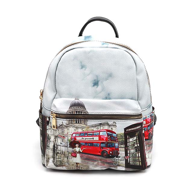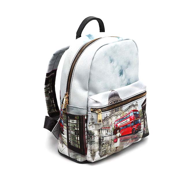 Zaino Donna multicolor in goffrato, con stampa Londra. Comparto con chiusura zip. All’interno fodera in tessuto logato con tasche multifunzione. Tasca frontale chiusa con zip e bretelle regolabili.