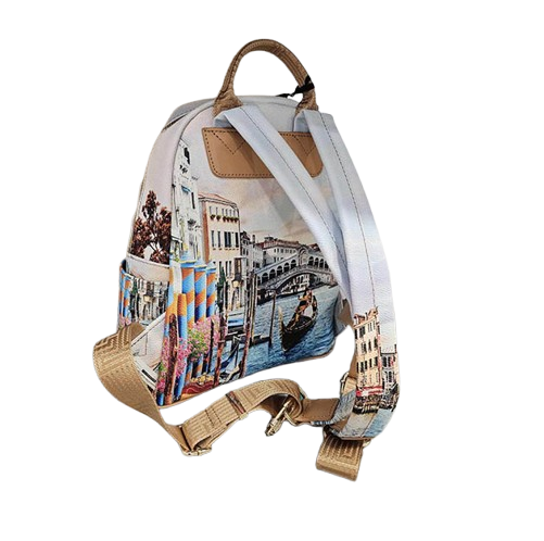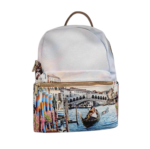 Zaino Donna multicolor in goffrato, tema Venezia. Comparto con chiusura zip. All’interno fodera in tessuto logato con tasche multifunzione. Tasca frontale chiusa con zip e bretelle regolabili. Portachiavi loggato. Comparto centrale Chiusura con zip Tasca esterna frontale chiusa con zip 2 tasche aperte laterali Manico superiore e spallacci regolabili